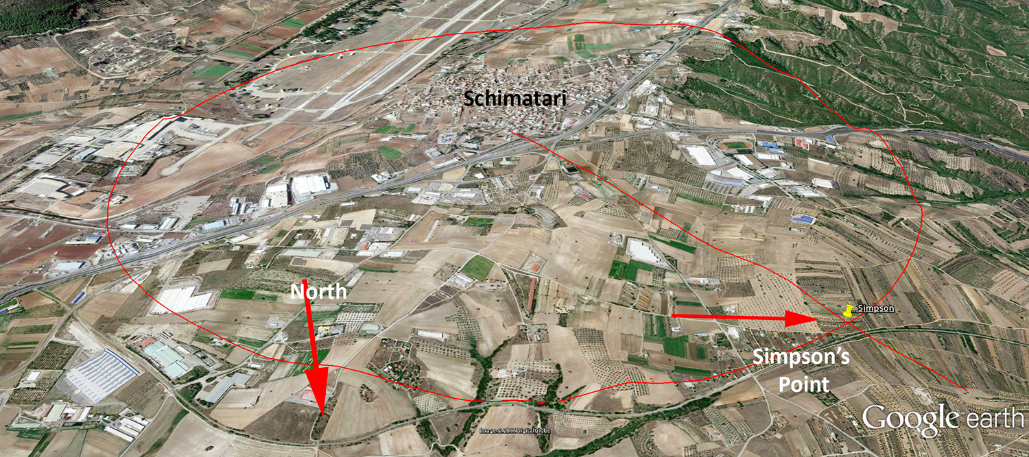 is, drawing a line exactly 135° (SE) of Schimatari) this gives us an unsatisfactory