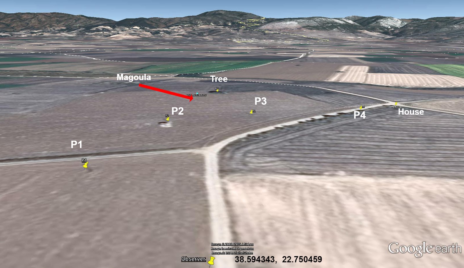 If you want to follow this example you should get into Google Earth and try to find those telephone poles. They're very hard to make out. I may not have matched them up correctly but I think that they're correct. The center of the magoula is at the blue marker. I make it to be 38.595921° N, 22.750690° E.