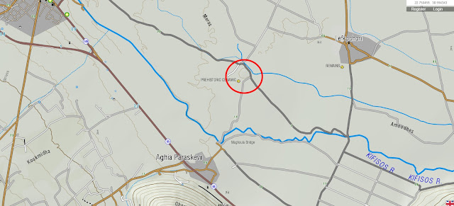 In this second map we've zoomed in on Kato Tithoreia. The mountain mass to the lower left is the north edge of the Parnassos massif. I circled the town of Aghia Paraskevi as the closest small town to the magoula.