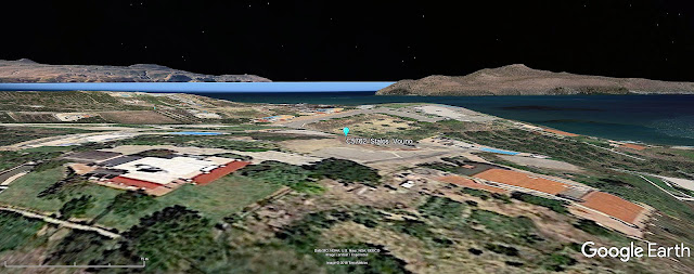 The boundary lines cross at the place where I have dropped the marker - very close to an attractive resort swimming pool. If this was the location of a Minoan house, as Hood suggests, then it would have enjoyed an extraordinary view. We've already seen that the entire Akrotiri Peninsula is visible to the E. Looking W the inhabitants would have enjoyed this view which extends from the Rhodopos Peninsula to the island of Agios Theodoros.