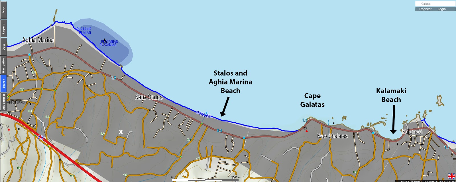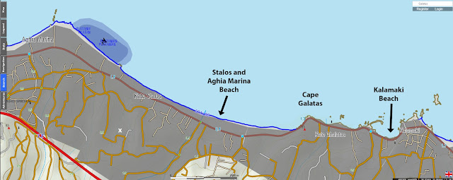 .6 km W of Kalamaki Beach. Overlooking the E end of the Stalos and Aghia Marina beach." [2]