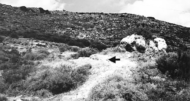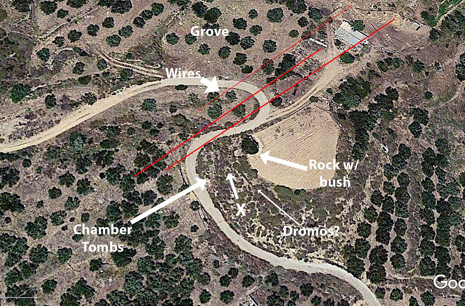 We're looking at a footpath which leads up to a large rock with bush on top of it. Behind the rock, and at no great distance, is a characteristic ridge covered with emergent rock and maquis. Between the rock and the ridge is a dark mass that we must interpret as a grove of trees, probably olives. Also, overhead, we can see at least two wires. In this photo they've been aliased into a series of dashes but there's no mistaking what they are. To the left (in this case SW) of the path is a complex of chamber tombs. Vavouranakis' arrow points to them.